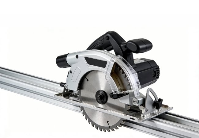 The track saw (or plunge saw) combines the portability of a circular saw with the straight-edge precision of a table saw. The base rides along a guide rail, ensuring perfect alignment and splinter-free cuts.
