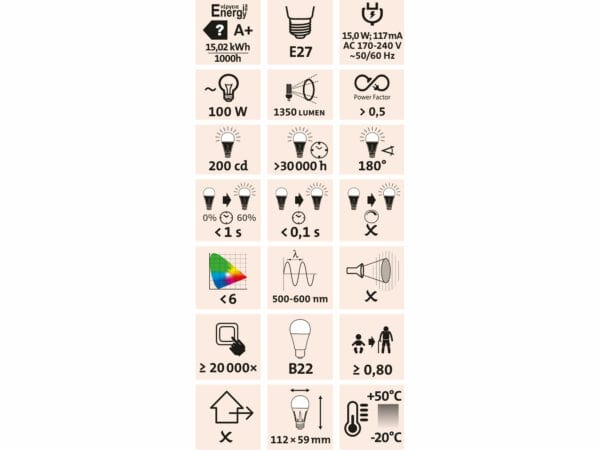 | technical parameters | 15 W, 1,350 lm, E27, warm white |