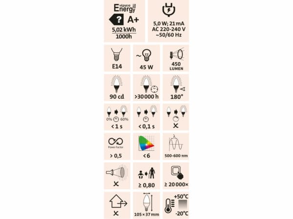 | technical parameters | 5 W, 440 lm, E14, day white |