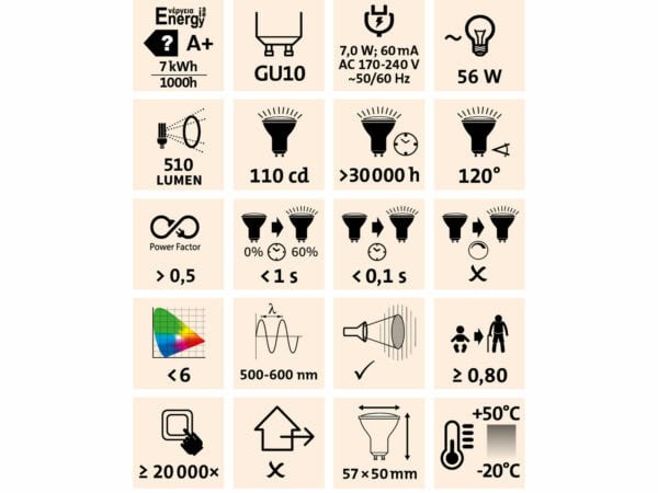 | technical parameters | 6 W, 450 lm, GU10, warm white |