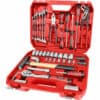 - Made of durable CrV material, this set includes a 45T ratchet, socket heads in various sizes, a lug nut socket, an extension adapter, a universal cardan, screwdrivers, wrenches, a drive guide, imbus, bits, an adapter with handle, a hammer with wooden handle, pliers, etc.