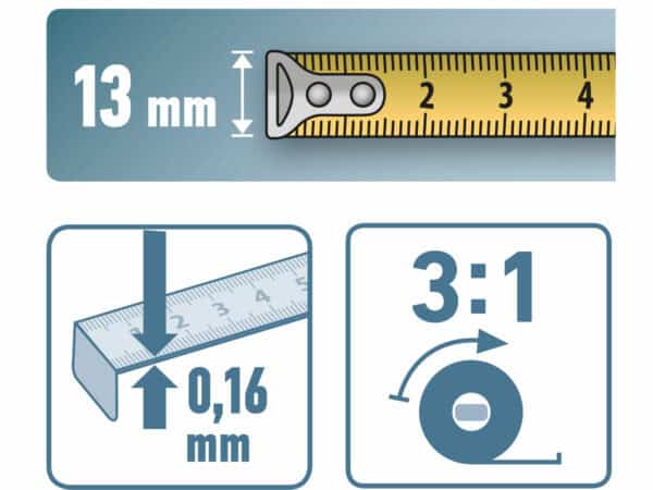 - 13mm Tape Width: The 13mm tape width provides additional strength and rigidity, preventing bending and ensuring accurate measurements even when extended to its full length. This feature is particularly beneficial when working on demanding projects that require precision.